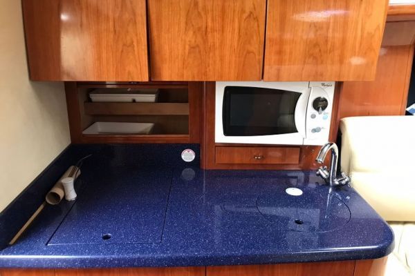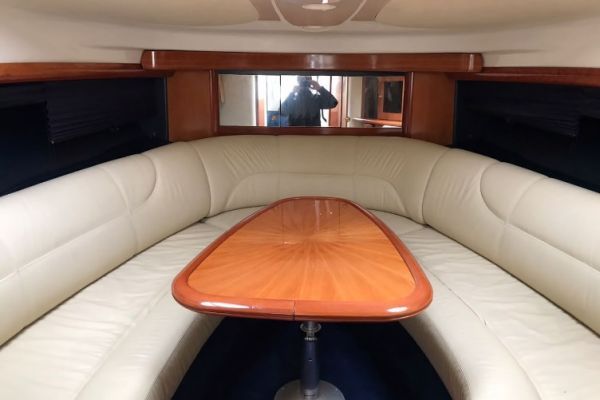 Interior: Cómodo salón con sillón en U y mesa central, rebatible para armar cama. Cocina con anafe eléctrico y microondas. Heladera interna. Baño con inodoro eléctrico y camarote en popa con 2 camas.