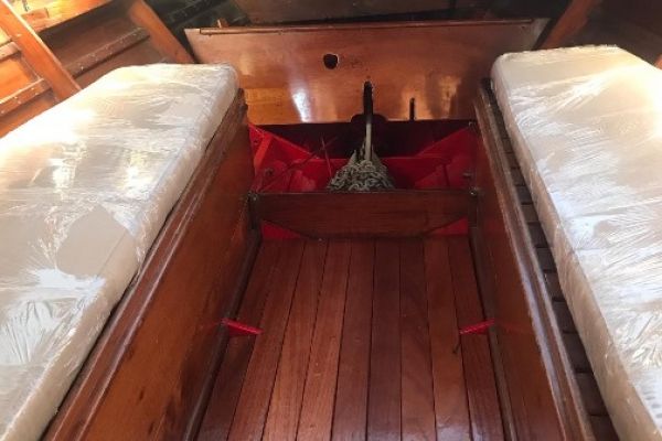 Fondo pintado con minio y cobre. En el interior tiene doble forro de cedro y pintura esmalte.