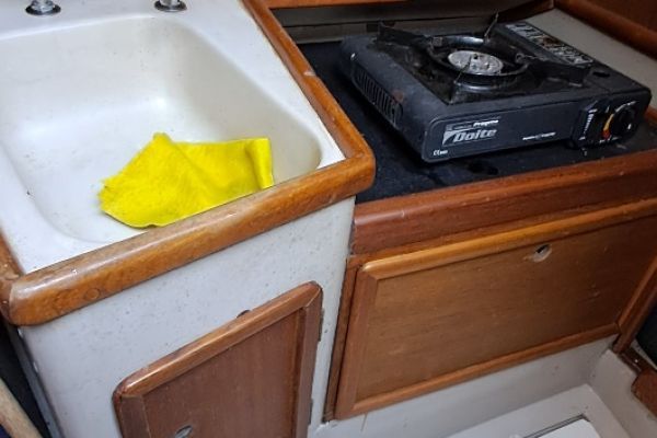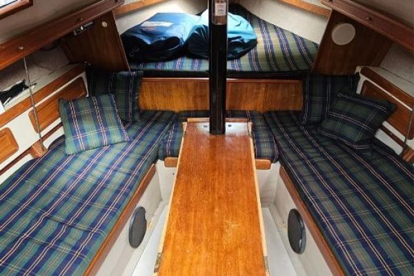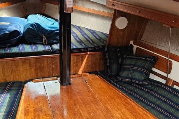 Comodidades: Comodo cockpit con caña de timon de acero inoxidable. En el interior el salón tiene mesa central desplegable, cama en cada banda y a proa cama doble. más a popa cocina con anafe a cartucho sobre banda de estribo y sobre babor baño con inodoro manula, compratimentado. A popa sobre banda de estribo mesa de navegación despegable y cama grande. Tanque de agua tipo vejiga de 50 lt. y sistema de agua de río. Luces Led